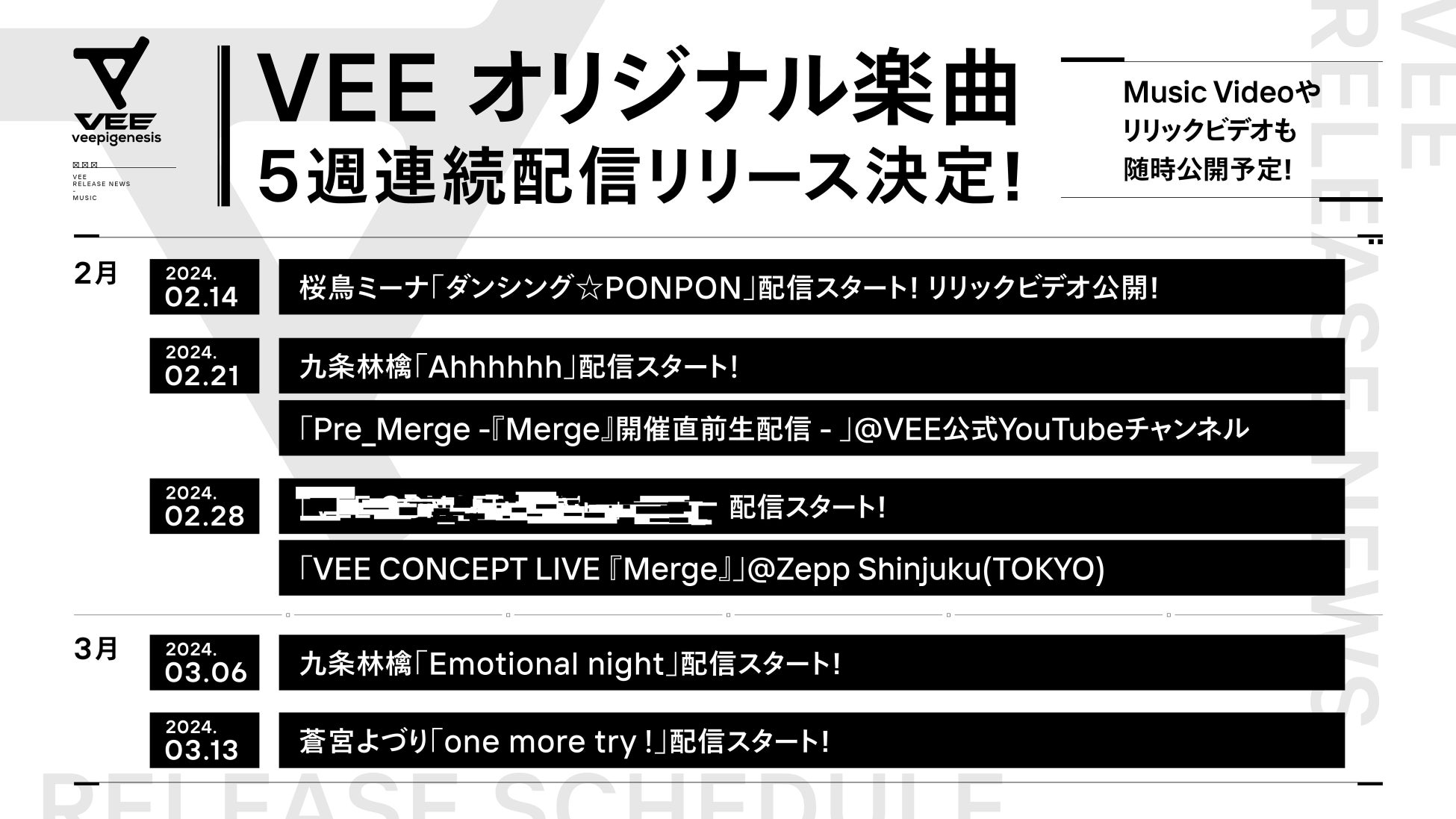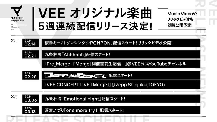 - VEEプロジェクトでは今後5週連続でオリジナル楽曲のリリースが予定
