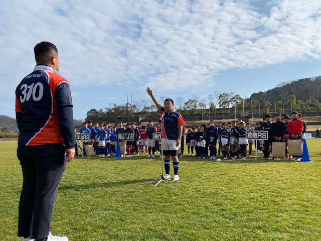 美作ラグビースクールの代表選手が選手宣誓を行い、激しい試合が行われました。
