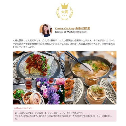 このアワードは、料理教室の普及を目的とし、会員数10万人を突破し、全国2,700以上の教室を掲載しています。