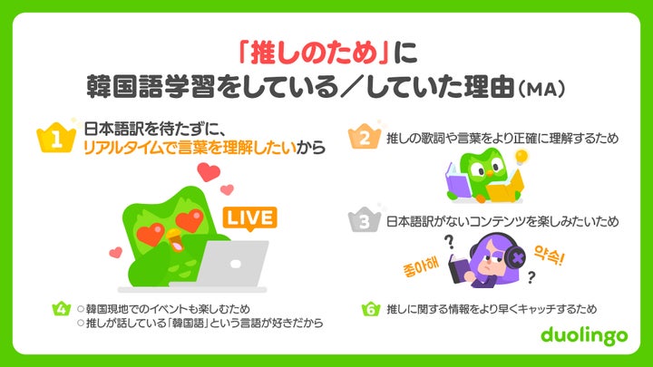 英語ではキャリアアップが主な理由でしたが、韓国語では好きなアーティストや芸能人の言葉を理解したいという動機が1位となりました。