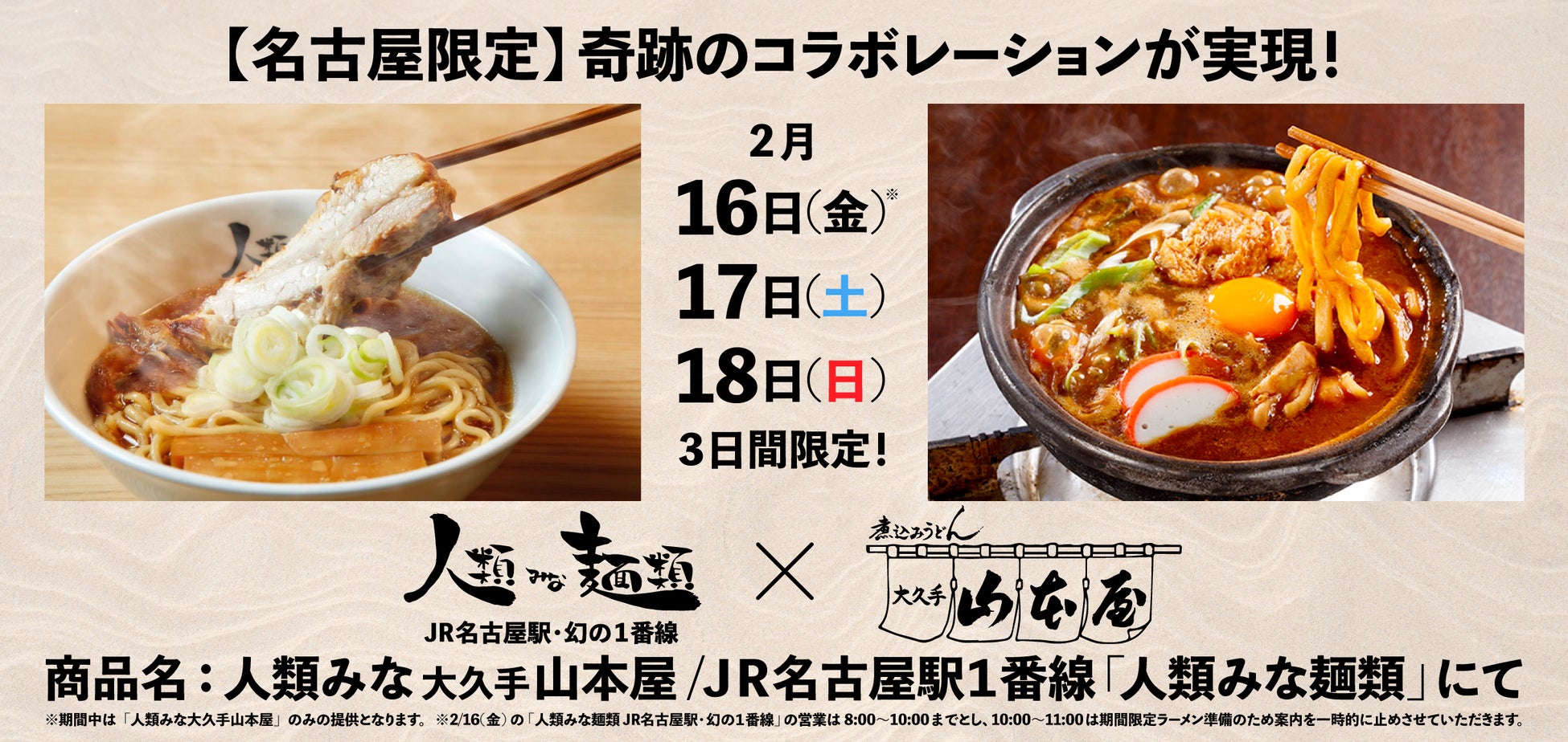 2月16日から3日間限定!大久手山本屋×人類みな麺類のコラボレーションラーメンがJR名古屋駅に登場!