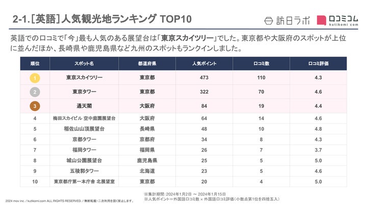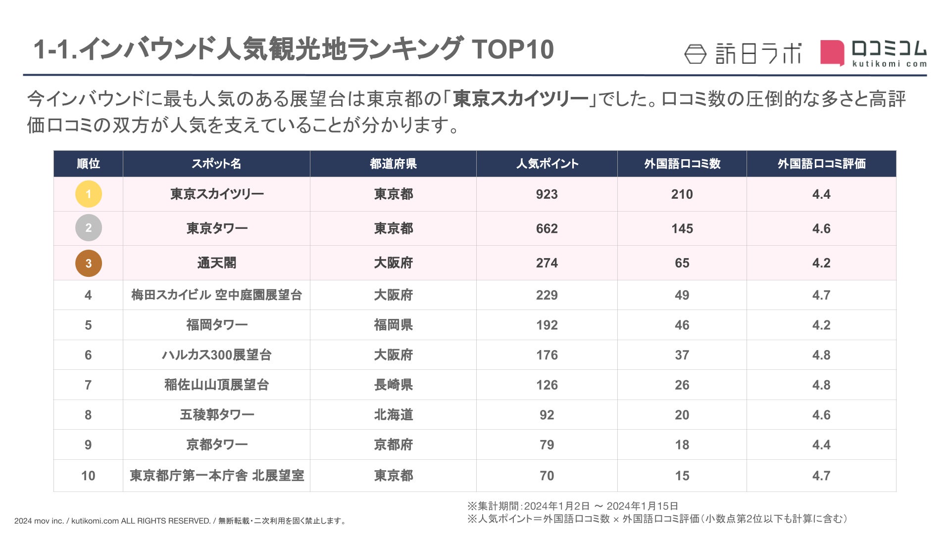 訪日ラボの調査によると、日本国内の145箇所の展望台の口コミを分析し、3つのインバウンドランキングが発表されました。