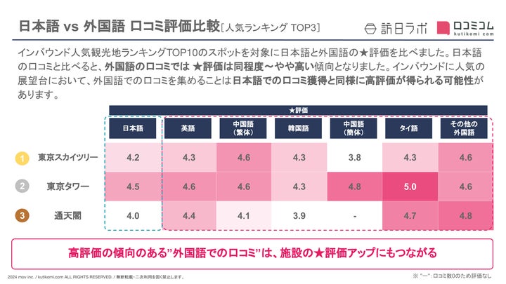 また、外国語の口コミ評価が日本語の口コミ評価よりも高い傾向があることも明らかになりました。