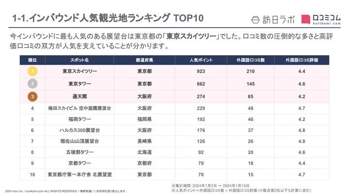 - 訪日ラボの調査によると、東京スカイツリーが最も人気のある観光スポットとなっている