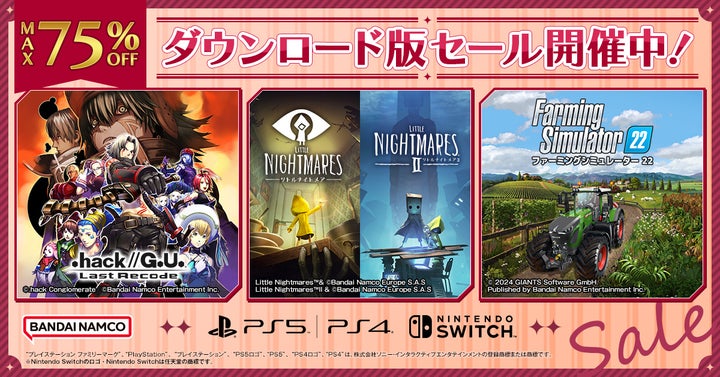 PlayStation™Storeでは、「.hack//G.U. Last Recode Welcome Price!!」が63%OFF、ニンテンドーeショップでは、「LITTLE NIGHTMARES-リトルナイトメア-1&2セット」が44%OFFとお得な価格で購入できます。