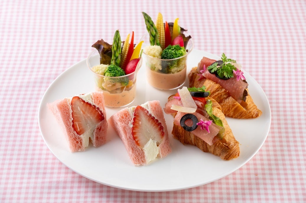 セイボリーでは、苺のフルーツサンドやクロワッサンのサンドイッチなど、ピクニック気分を味わえるメニューが提供されます。