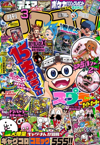 「月刊コロコロコミック」3月号が発売されます!今回の特典には「スプラトゥーン3」の缶バッジとステッカー、さらに「デュエル・マスターズ」の限定イラストカードなどが盛り込まれています。