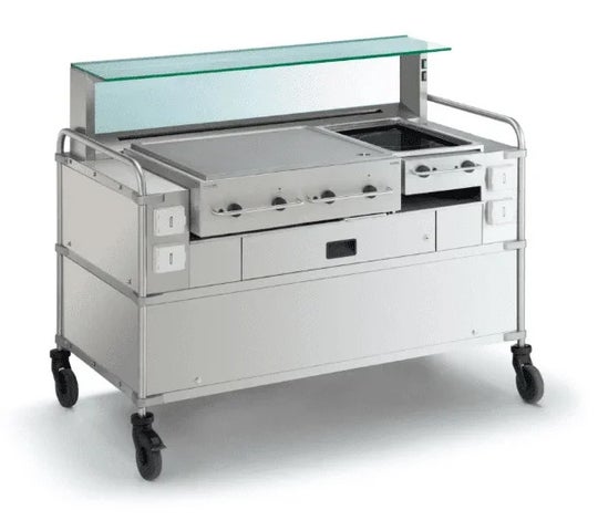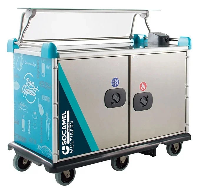 このワゴンはクックチル・ニュークックチル食品や完調品の保冷から自動再加熱が可能で、対面で盛り付けることによりサービスの向上が図れます。