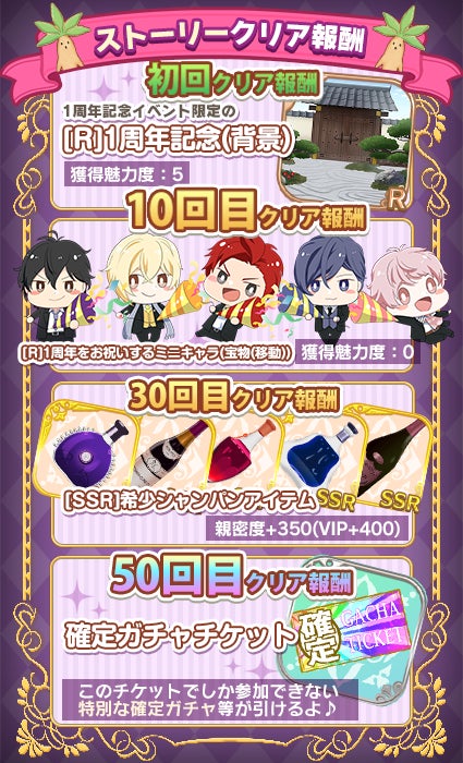 期間限定で復刻オリジナルストーリー「1周年記念」が登場し、デート回数に応じて豪華報酬がもらえる。