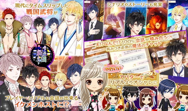 本作は、『100%会話が噛み合う魔法のチャット』として、戦国時代から現代へタイムスリップしたイケメン武将(ホスト)と、定型文ではなく、ユニークな会話が出来る恋愛趣味レーションゲームです。