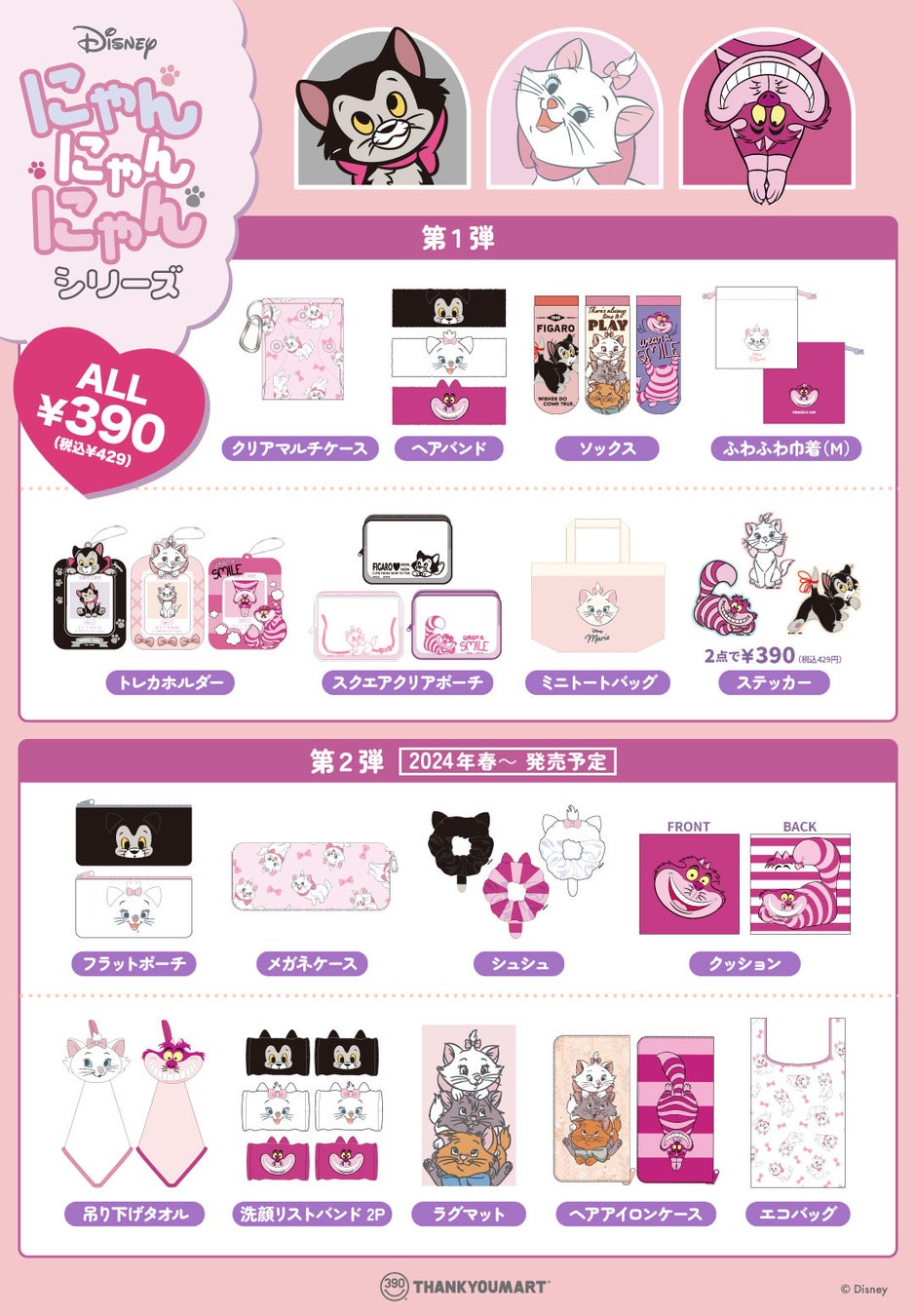 サンキューマートでは、2024年2月22日の「猫の日」に合わせて、ディズニーアニメーションの「チェシャ猫」、「マリー」、「フィガロ」という3匹のネコキャラクターに焦点を当てたデザインアイテムを販売します。