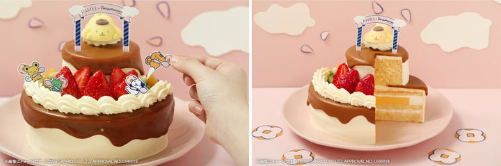 直径約15cmと約9cmのシフォンケーキを重ねた豪華な2段ケーキで、ピックで模ったお友達たちと一緒に「ポムポムプリン」の誕生日を盛り上げます。
