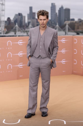 一方、オースティン・バトラーはカスタムメイドのグレースリーピース・ダブルブレストスーツを着用していました。