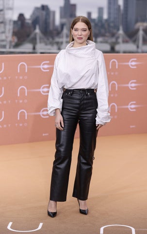 レア・セドゥはホワイトのブラウストップスとブラックのレザーストレートパンツに、ルイ・ヴィトンのブラックのレザーパンプス、コンステレーションイヤリングとリングを合わせていました。