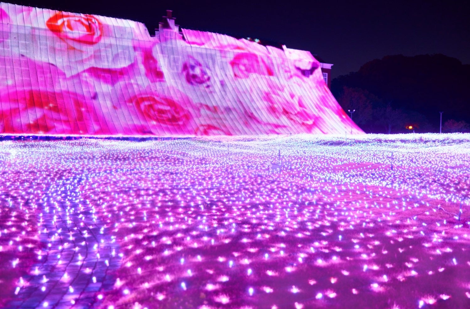 ピンクや赤など様々な色のバラが、壮大なスケールで展示されています。