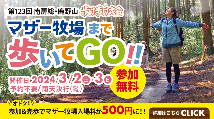 千葉県富津市のマザー牧場では、2024年3月2日(土)・3日(日)の2日間限定で、第123回目のウォーキングイベント「第123回 マザー牧場 歩け歩け大会」が開催されます。
