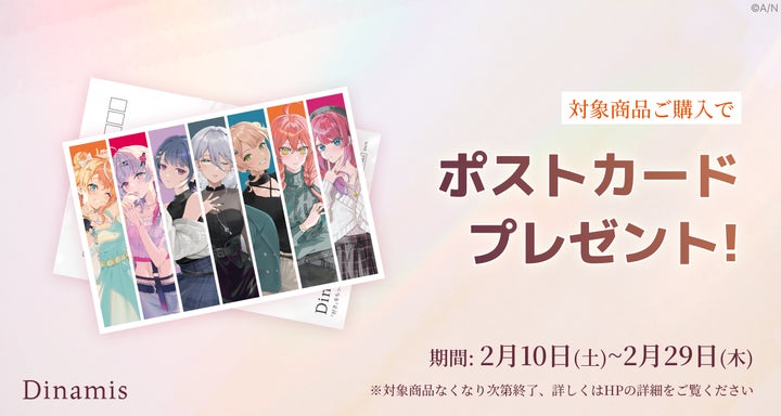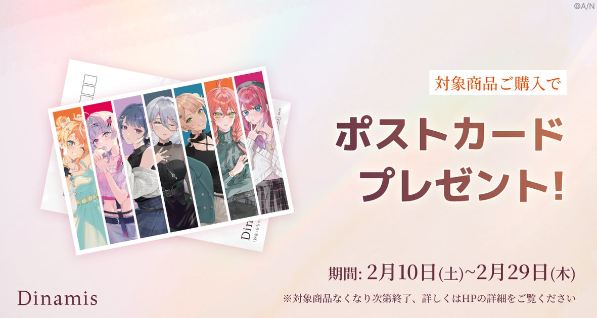 • Dinamisはアクセサリーブランドで、にじさんじ所属の『Idios』のメンバー7人がプリントされたオリジナルポストカードがもらえるノベルティキャンペーンを開催