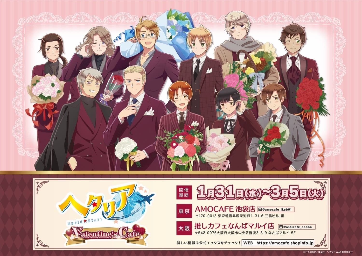 株式会社faveが展開するコラボカフェ「AMO CAFÉ池袋店」と「推しカフェなんば店」では、アニメ「ヘタリア World★Stars」Valentine’s Cafeが2024年1月31日から3月5日まで開催されます。