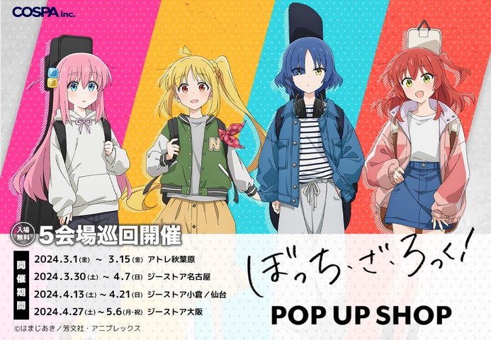 2024年3月1日から、アニメ「ぼっち・ざ・ろっく!」のポップアップショップが開催されます!秋葉原、名古屋、小倉、仙台、大阪の5会場で、新作グッズや特典が先行販売されます。