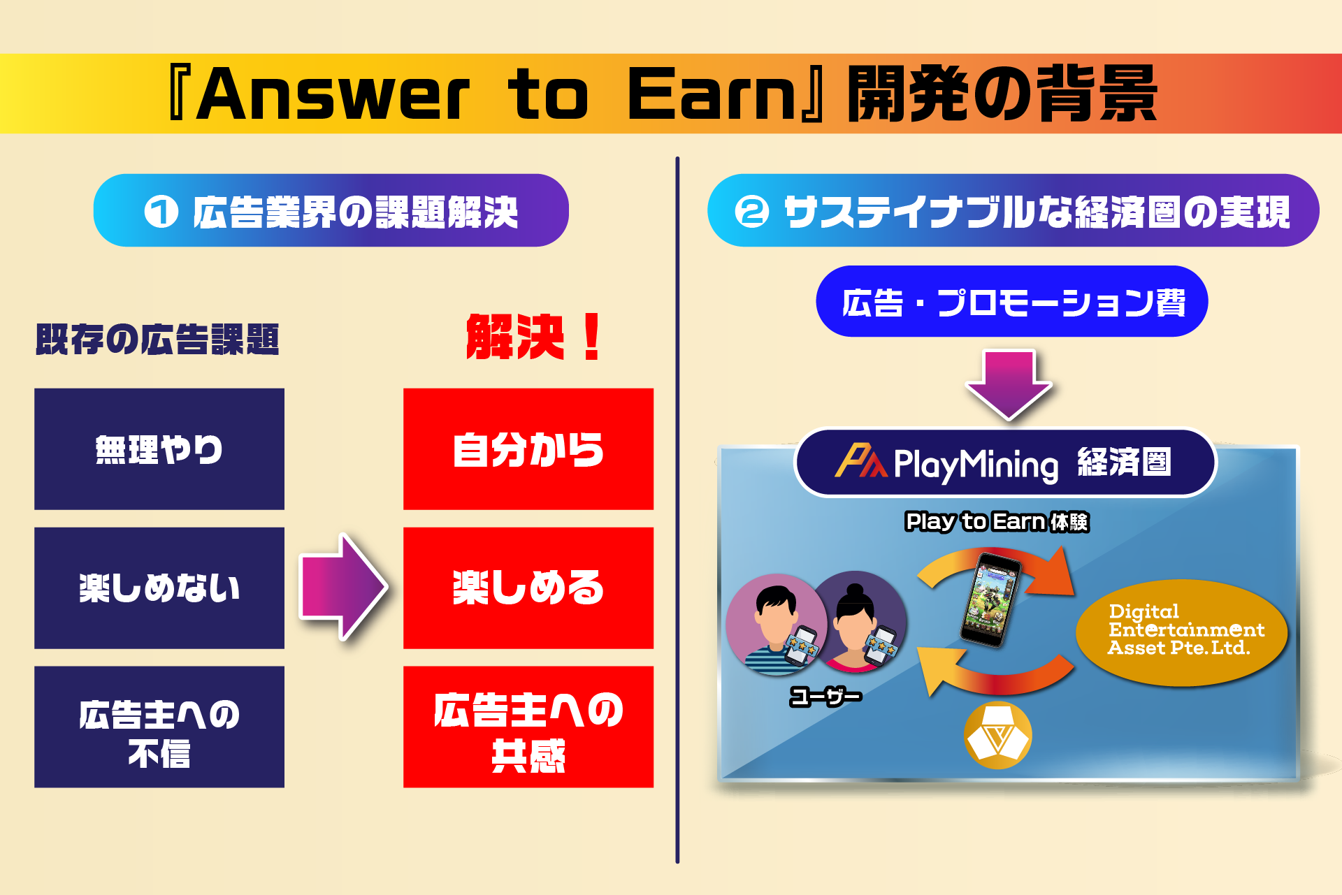 インターネット広告に対して70%以上の人々が「ストレスを感じる」と回答した調査結果があり、広告がユーザーにとって不快で、ストレスを感じさせるものになりやすいという課題があります*。こうした広告業界が抱える課題に対して、ゲーミフィケーションとWeb3の仕組みを活用することで、よりユーザーフレンドリーな広告体験を目指します。また、GameFiプラットフォーム「PlayMining」に「Answer to Earn」が追加されることで、企業による広告・プロモーション費の流入が期待できます。このようにPlayMining経済圏への資金流入を拡大することで、経済圏全体としての安定化とDEAPcoin(DEP)の価値向上を図ります。