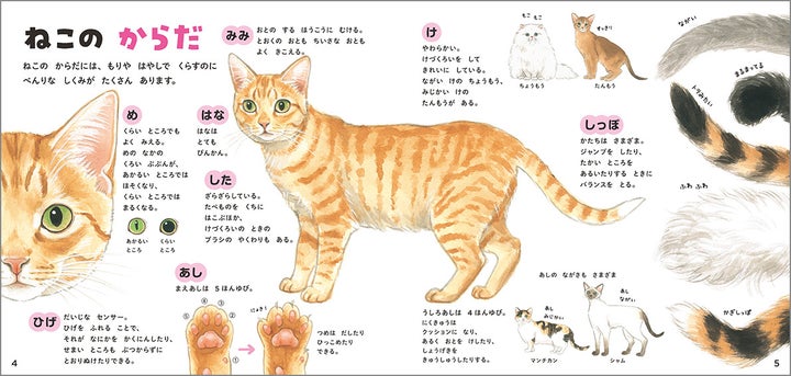 - ねこの毛色や模様、野生のネコ科動物との比較など、興味深い情報が盛りだくさん