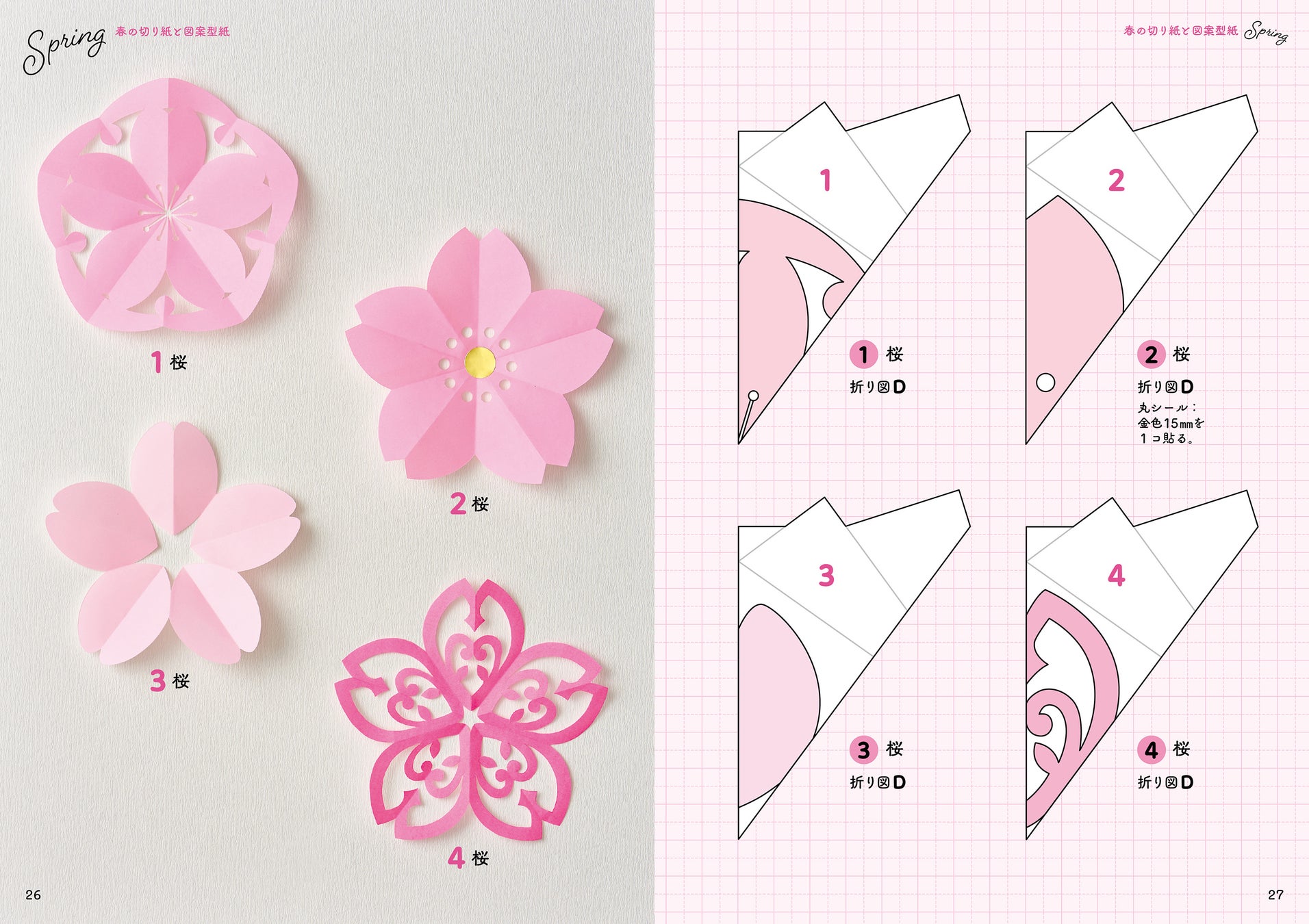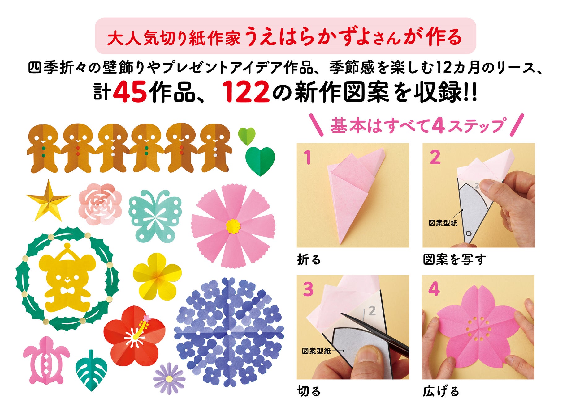 切り紙の基本は4ステップで、実物大図案付きなので初心者でも失敗なく作ることができます。