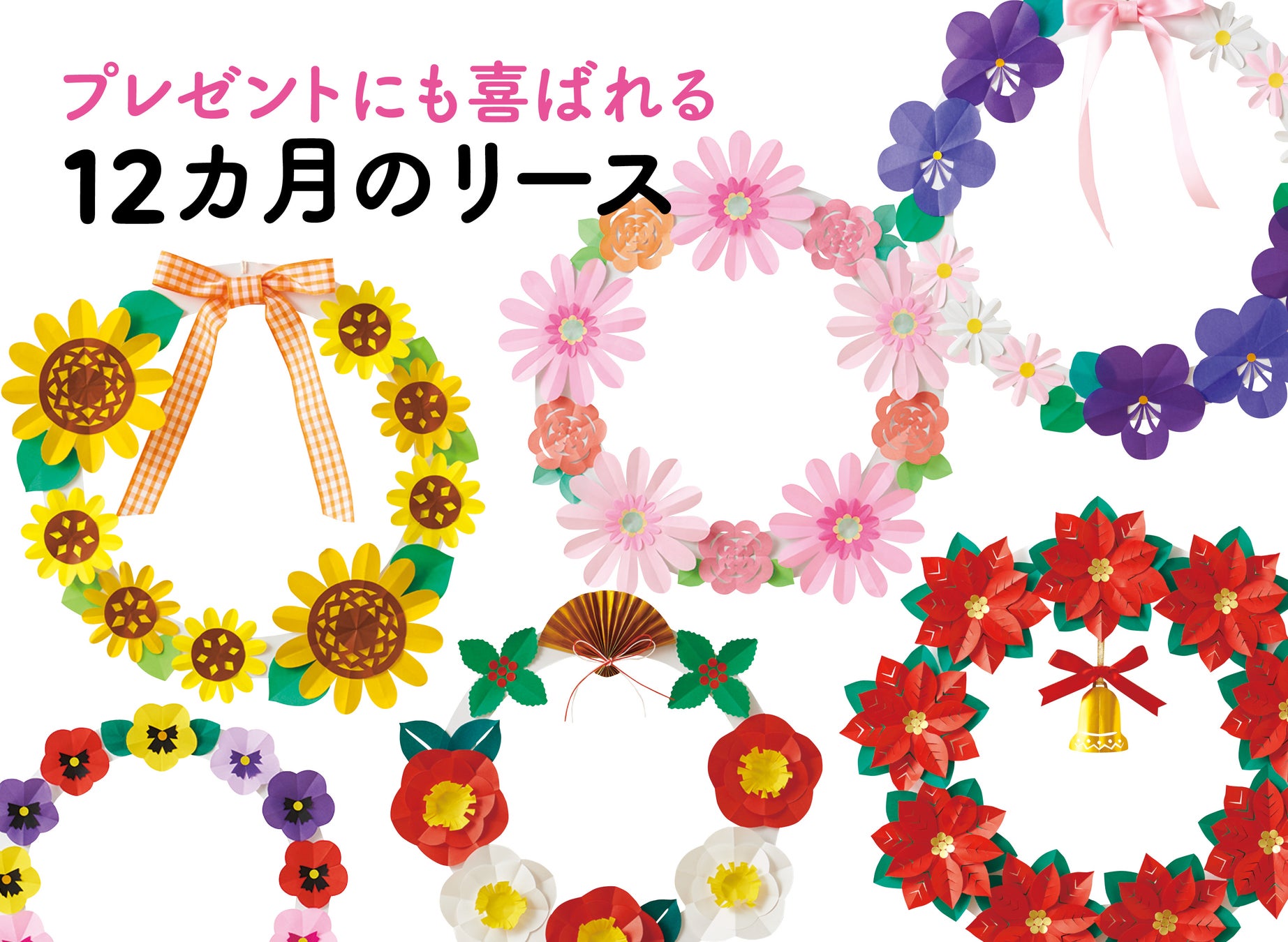 また、12カ月のリースのアイデアも提案しており、折り紙は100円ショップで手に入るもので作ることができます。