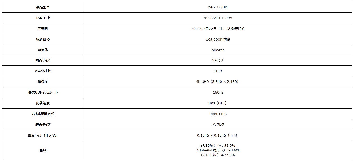 - MAG 322UPF: 32インチの4K UHD解像度、高速応答と豊富な機能のゲーミングモニター