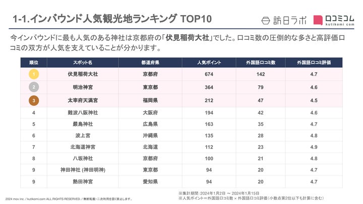 訪日ラボが実施した調査によると、国内の神社362箇所の口コミを分析し、インバウンド人気観光地ランキングを発表しました。