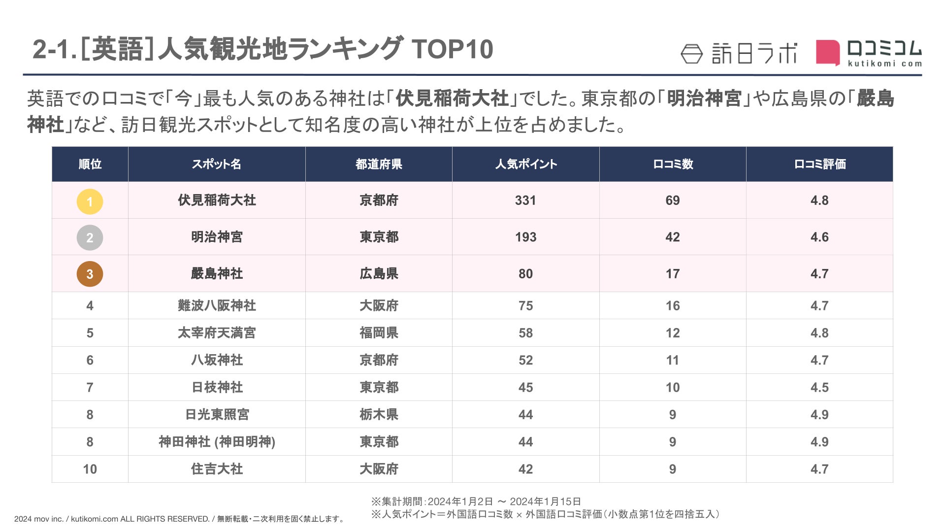 その結果、伏見稲荷大社が1位となり、外国語口コミも多く寄せられていることがわかりました。