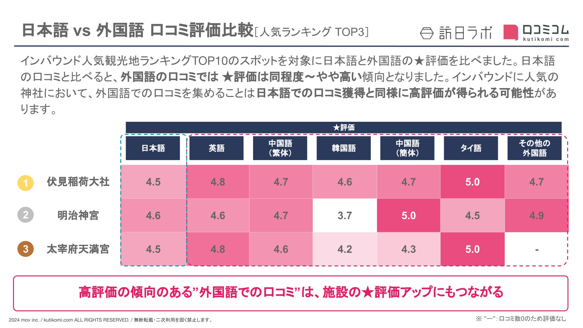 また、外国語口コミと日本語口コミの評価を比較した結果、外国語口コミの方が高評価を得ていることも明らかになりました。