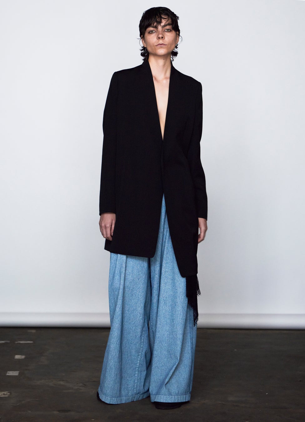 アシンメトリカルジャケットには断ち切りのレースが付属し、デニムカラーのジーンズは上品な印象を与えます。