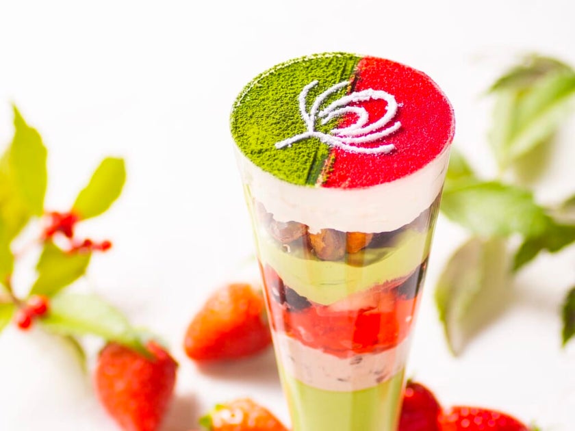 - パフェには抹茶クリームやあずきクリーム、抹茶プリン、フレッシュ苺などが使われ、濃厚な抹茶ソースがかかっている