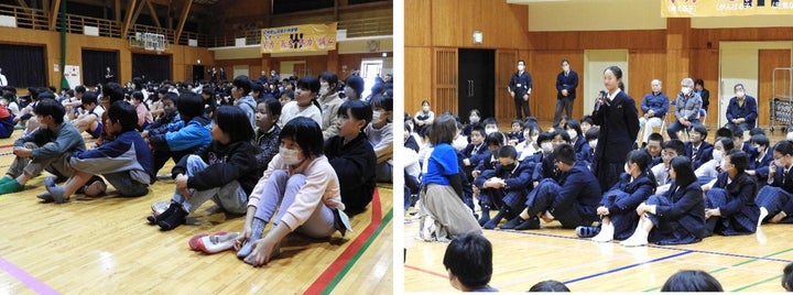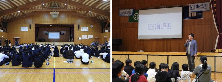 参加者は平岩小中学校の小学生190名で、上映会では海と日本プロジェクトの概要説明やアニメの上映が行われました。