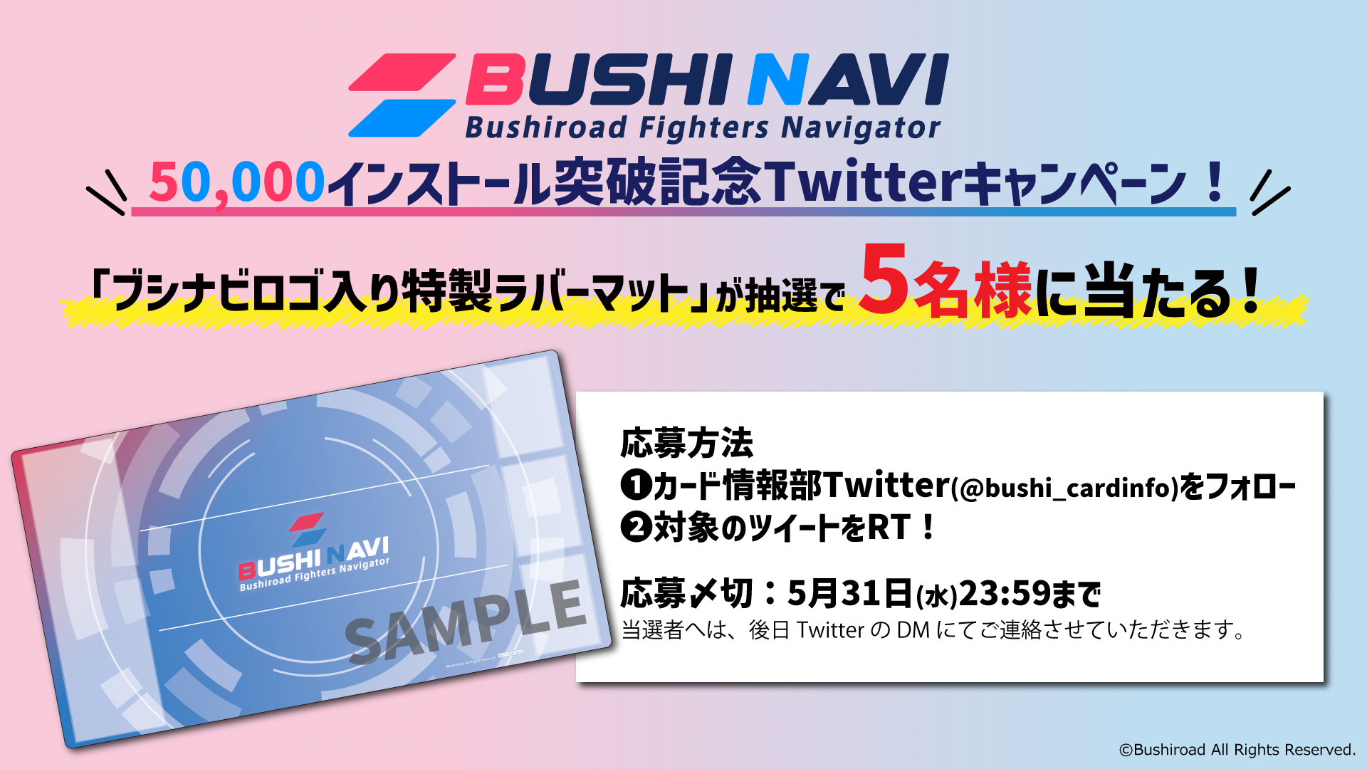 ブシロード公式TCGツール「ブシナビ」が50,000インストールを突破したことを記念して、Twitterキャンペーンを実施中。