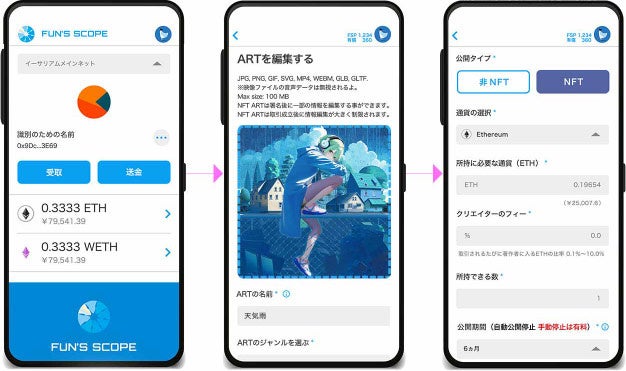フォア株式会社は、イラスト・写真・AIアート投稿サイトから作品をシームレスにNFTアート化することができるミュージックプレイヤーアプリ「FUN’S SCOPE」をリリースする。