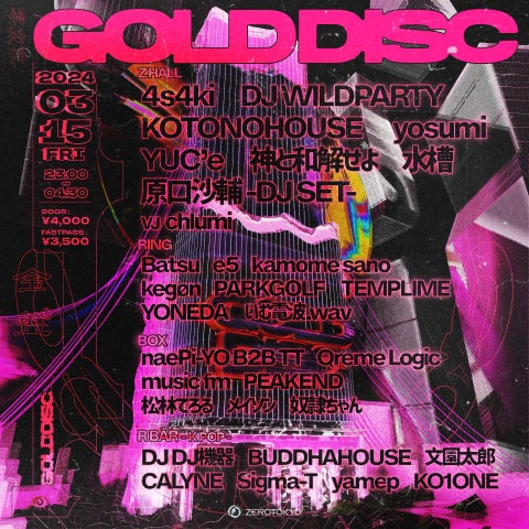 2024年3月15日に開催されるGOLD DISCイベントは、4フロア回遊型で、Z HALLでは4s4kiやKOTONOHOUSE、YUC’e、TEMPLIMEなど注目アーティストが出演し、VJにはchlumiが担当する。