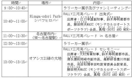 2024年2月18日に開催される「RALLY三河湾パレード in 名古屋」のイベントは、午前9時30分から午後1時30分まで行われます。
