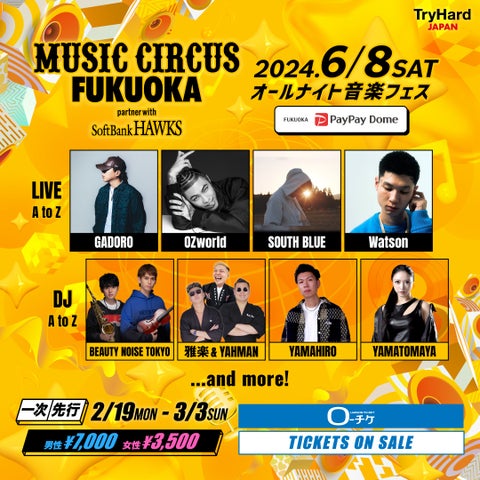 2024年6月8日に福岡PayPayドームで開催される音楽フェス「MUSIC CIRCUS」の5周年イベントには、GADOROやOZworldなどのアーティストが出演します。