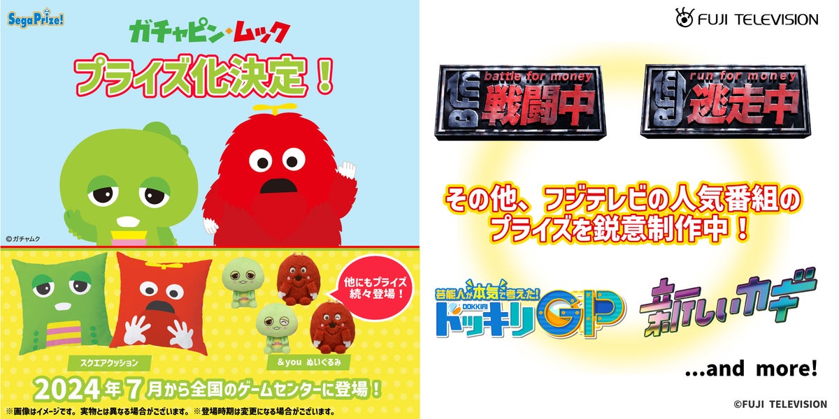 ガチャピン・ムックがセガプライズで登場!フジテレビ人気番組もプライズ化!2024年7月から展開予定