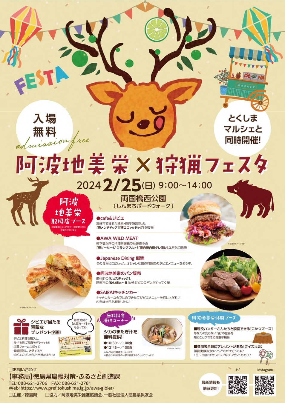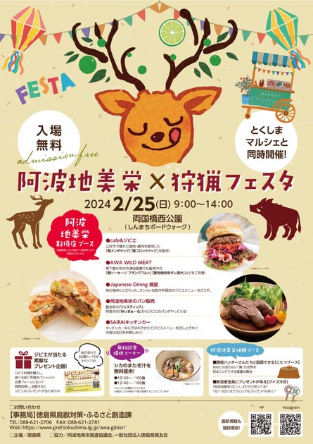 阿波地美栄×狩猟フェスタが開催され、ジビエ料理や加工品の販売、狩猟体験、阿波地美栄料理の試食などが楽しめます。