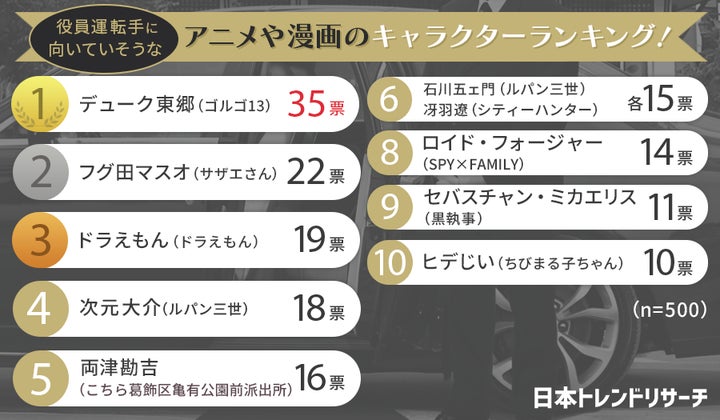 役員運転手にふさわしいアニメや漫画のキャラクターに関するアンケート結果が発表されました。
