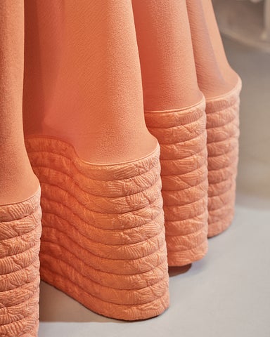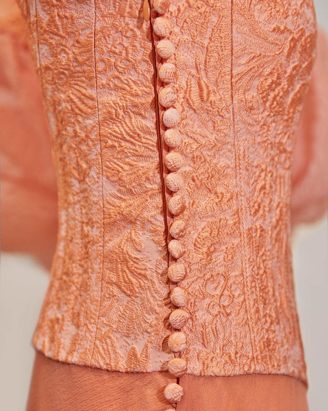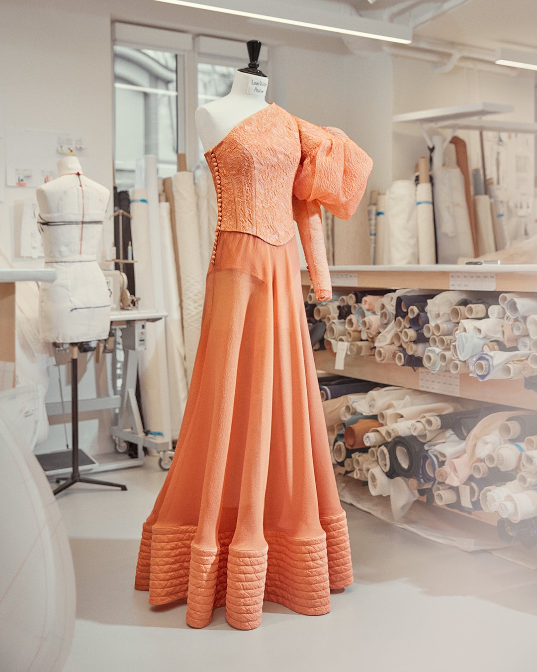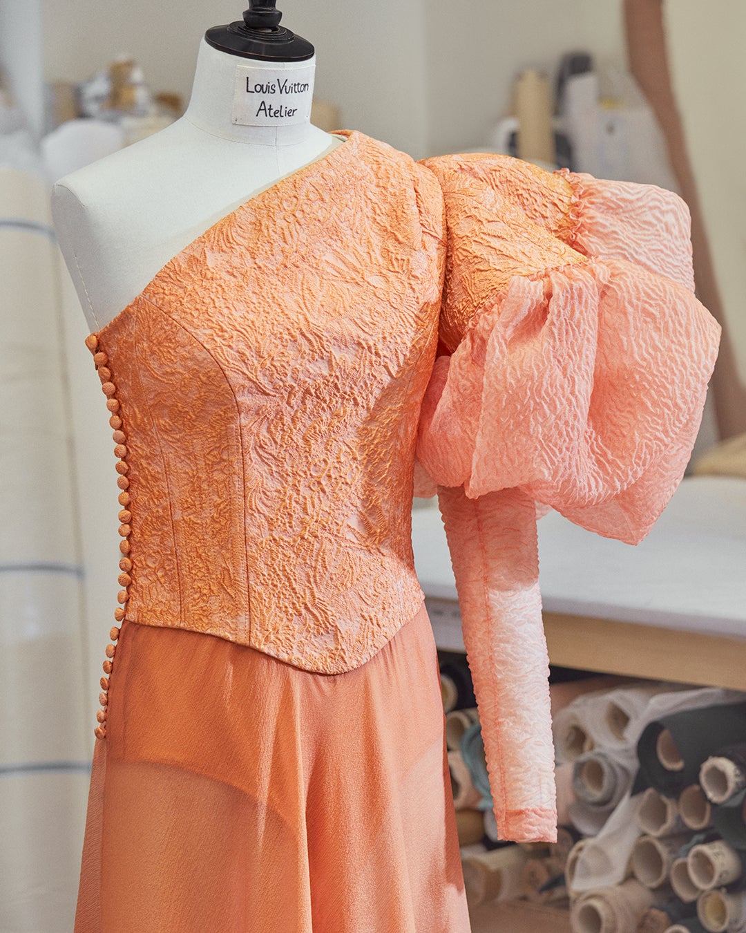 ドレスは20メートルの素材を使用し、450時間以上かけて制作されたワンショルダーのビスチェドレスで、異なる柄をミックスしたデザインです。