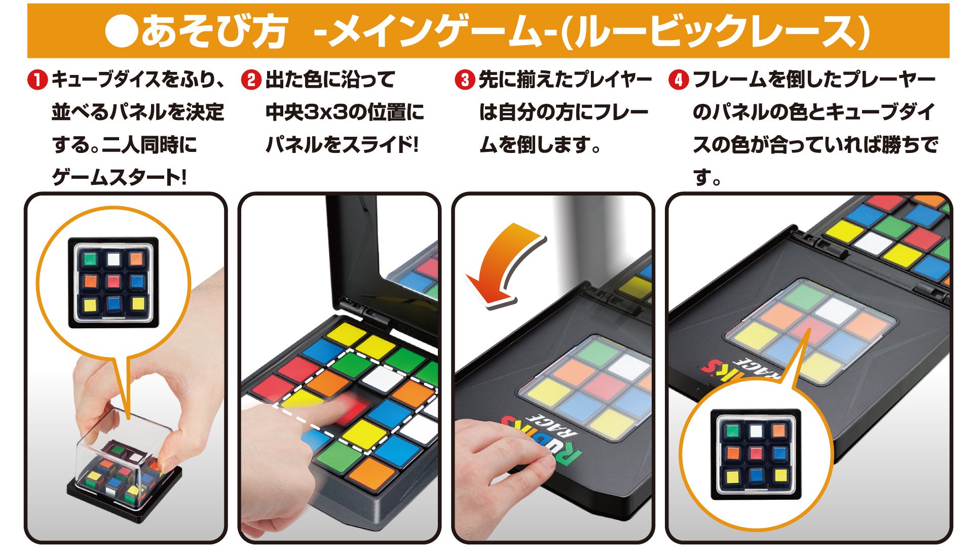 - ルービックキューブカラーのパネルをスライドしてお題となる“キューブダイス”の色に揃える、1~2人で遊べる対戦型スライドパズルゲーム。