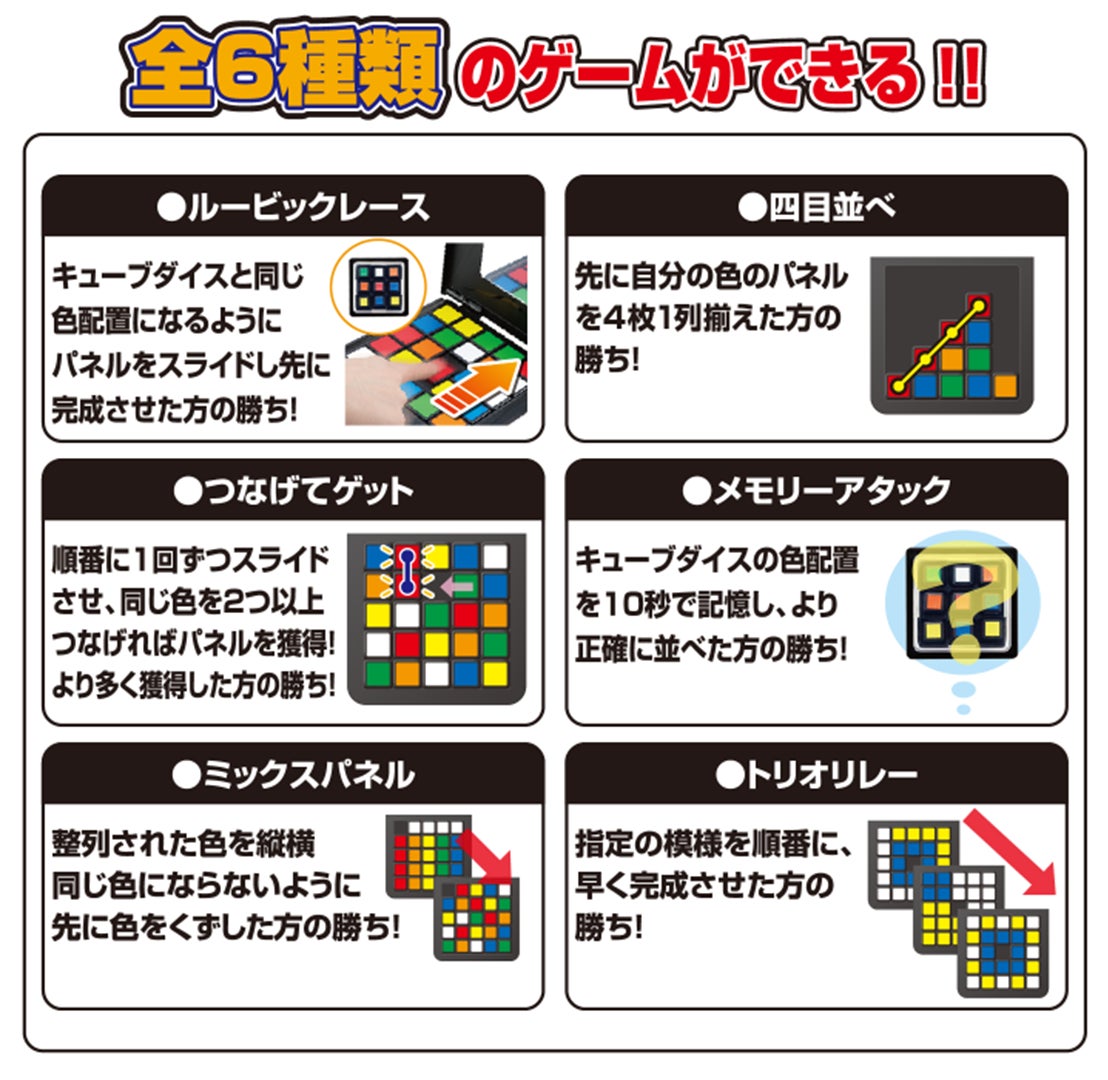 ルービックキューブカラーのパネルをスライドしてお題となる“キューブダイス”の色に揃える、1~2人で遊べる対戦型スライドパズルゲームで、全6種のゲームルールで遊ぶことができる。