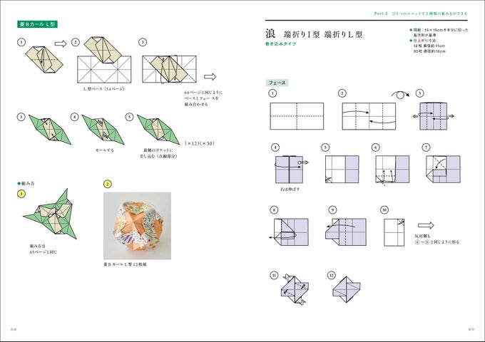 この本では、「ベース」と「フェース」の2枚の紙を使って、さまざまなくす玉の折り方が紹介されています。
