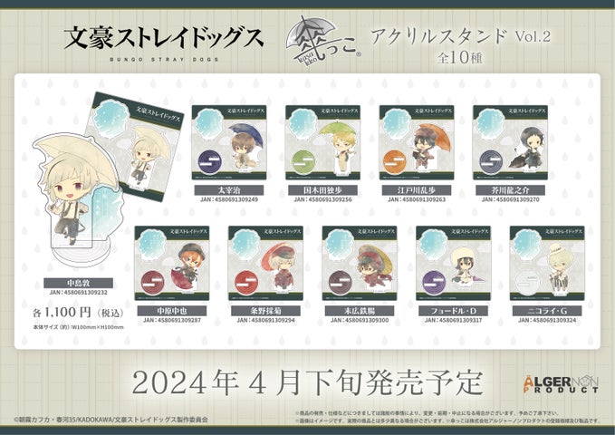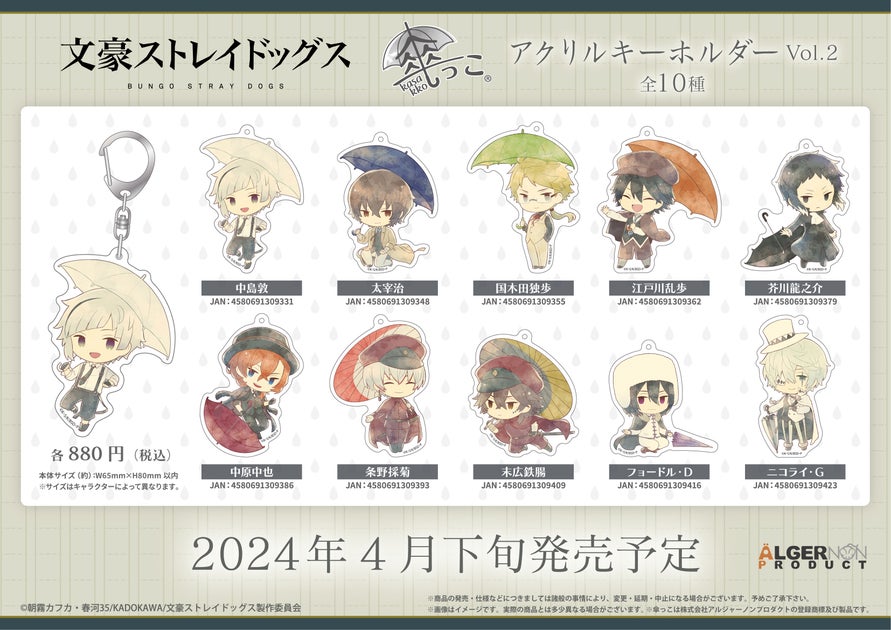 2024年2月20日に予約受付が開始される「文豪ストレイドッグス」の傘っこシリーズは、アクリルキーホルダーが880円で全10種類、アクリルスタンドが1,100円で原稿風デザインが特徴です。