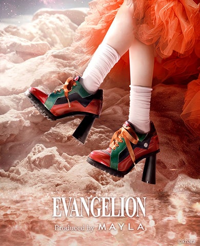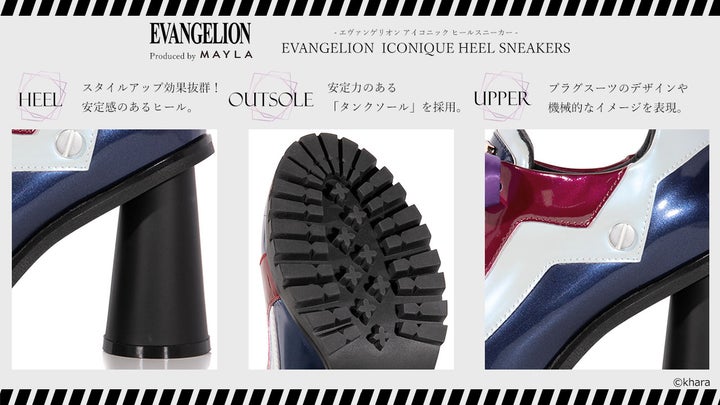 新商品「ヒールスニーカー」はヒールとスニーカーを融合させ、『エヴァンゲリオン』の世界観と4人のパイロットをイメージしたモードな一足です。
