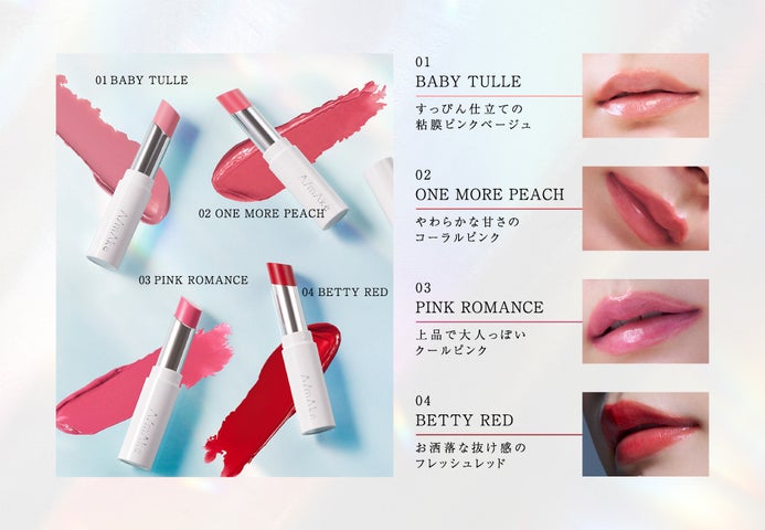 - 4色展開で1,430円、透け感発色で唇に密着してツヤ&色味をキープ