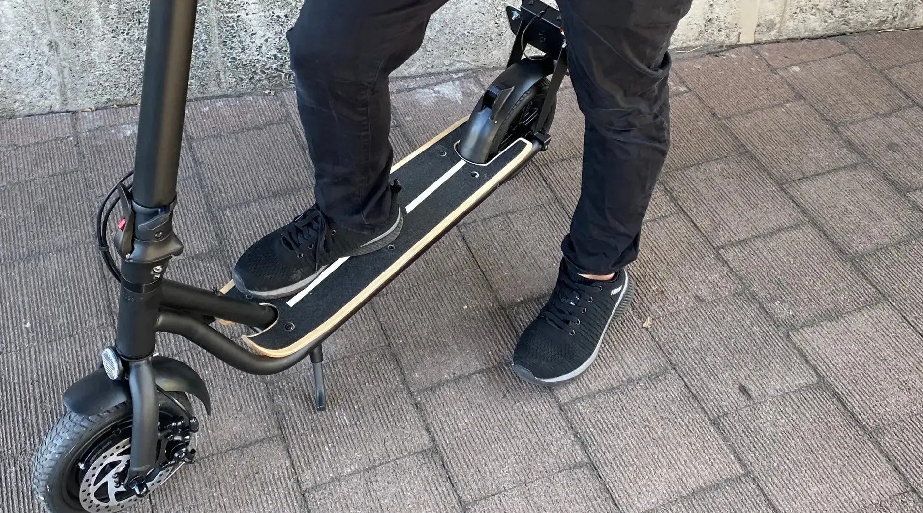 他の電動キックボードとは趣の異なる、スケートボードと同じウッドデッキを採用したスタイリッシュなデザイン。